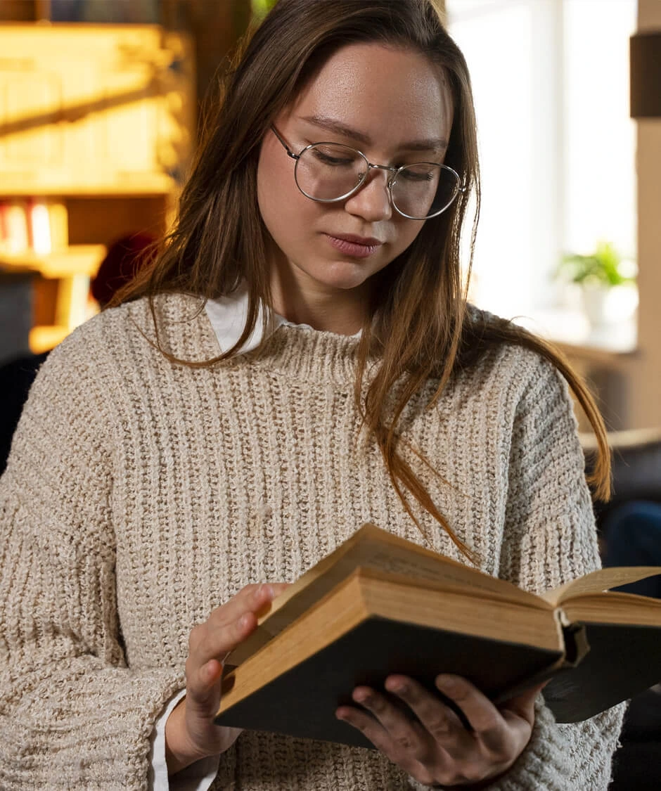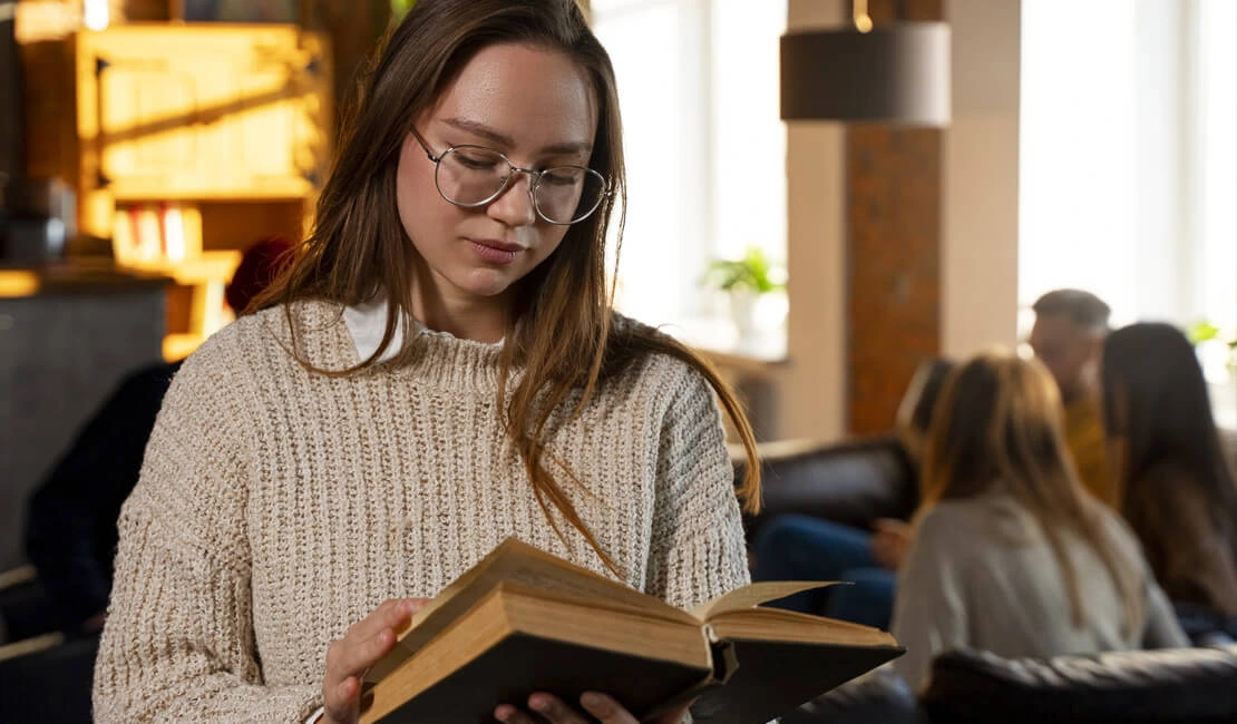 A young woman wearing glasses and a beige sweater reads a book. Blurred people are in the background